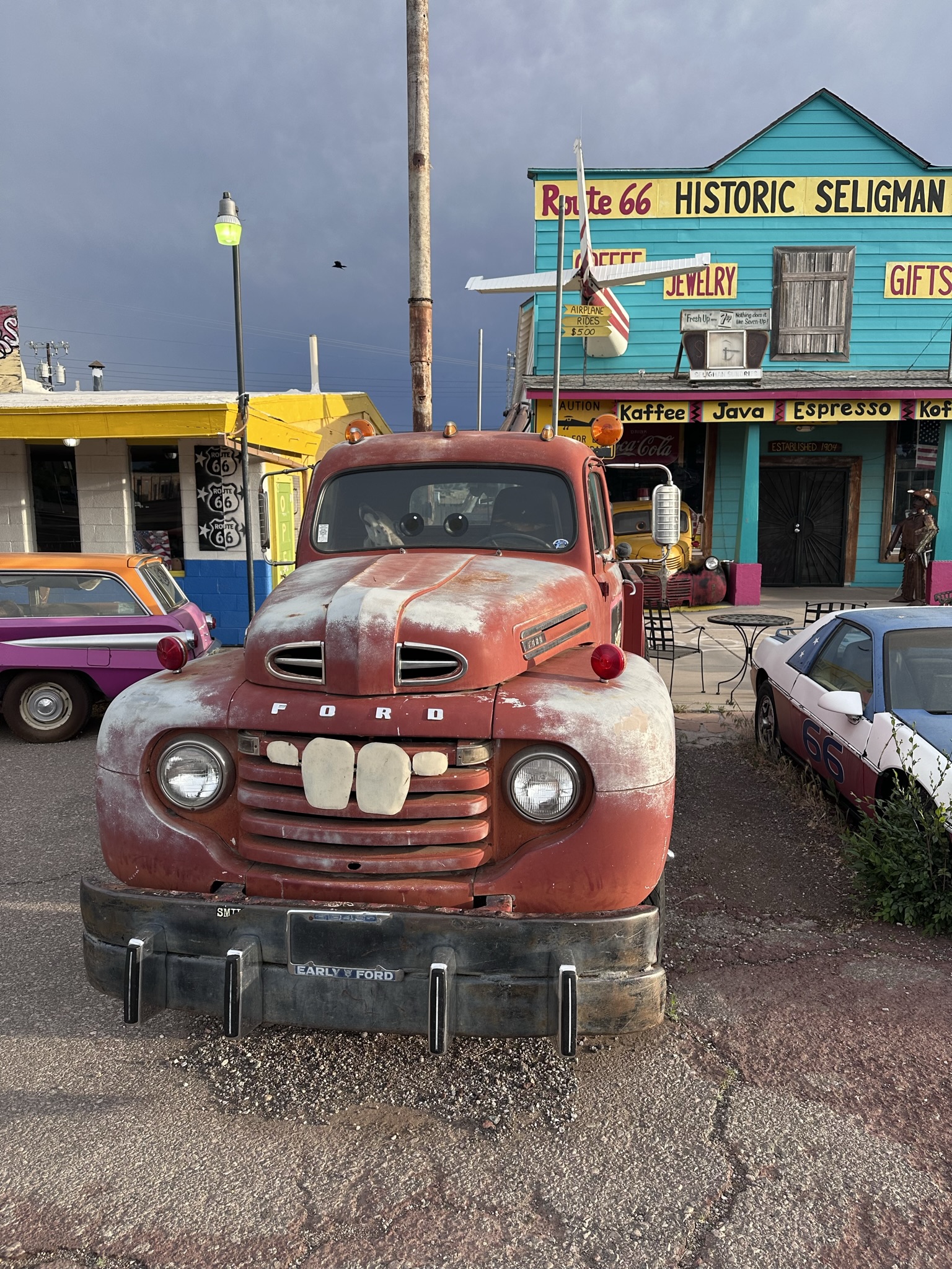Después de desayunar, retomamos nuestra aventura por la legendaria Ruta 66, sumergiéndonos en más tramos de esta carretera cargada de historia. Nuestro recorrido nos llevará por el encantador pueblo de Seligman, un lugar que parece haberse detenido en el tiempo, con su estética clásica y sus tiendas temáticas de la Ruta 66, perfectas para una breve parada y algunas fotos.